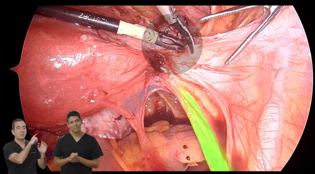• Lado derecho: identificación del ureter con verde mostrando la distorsión y adherencia al utero de éste en relación al nódulo en anexo operado previamente